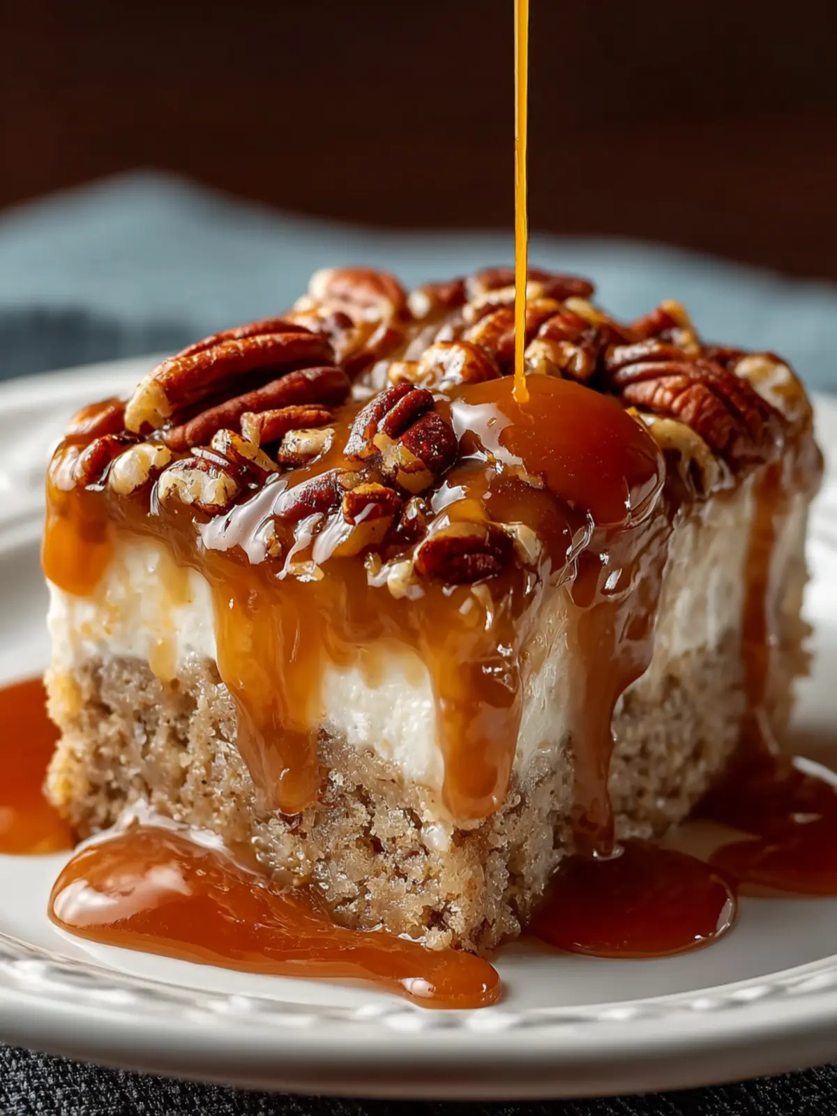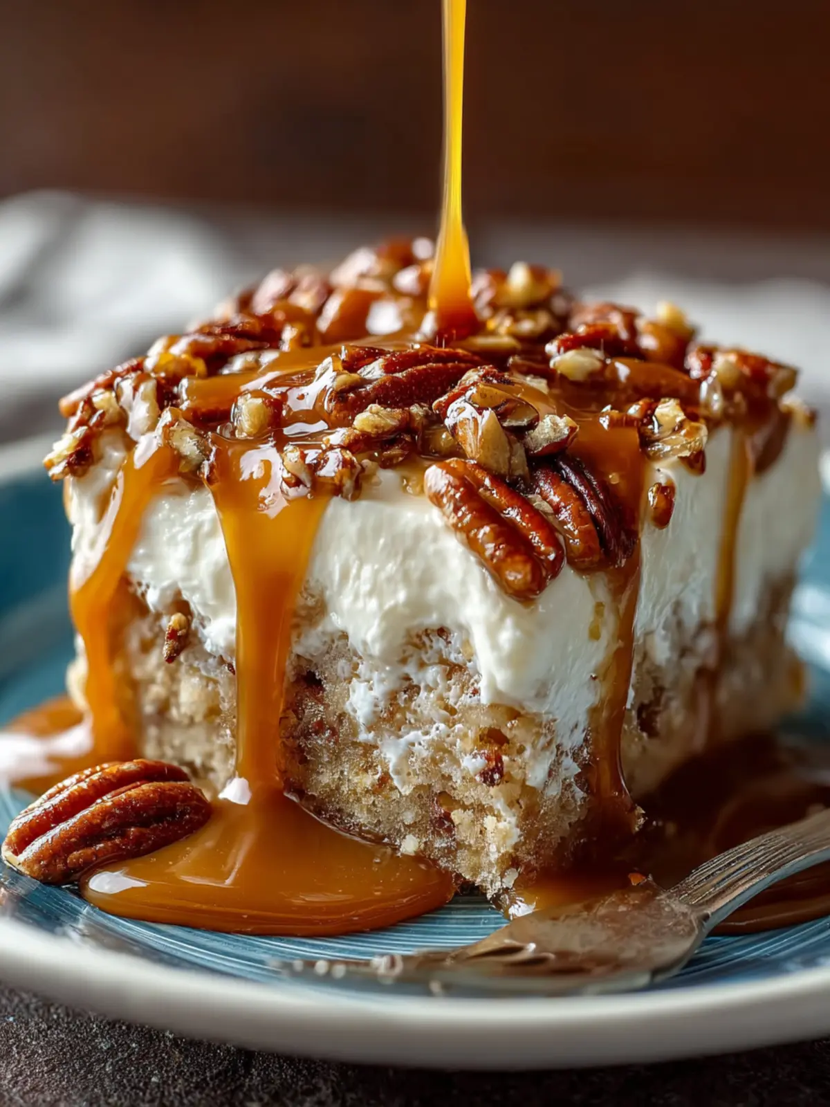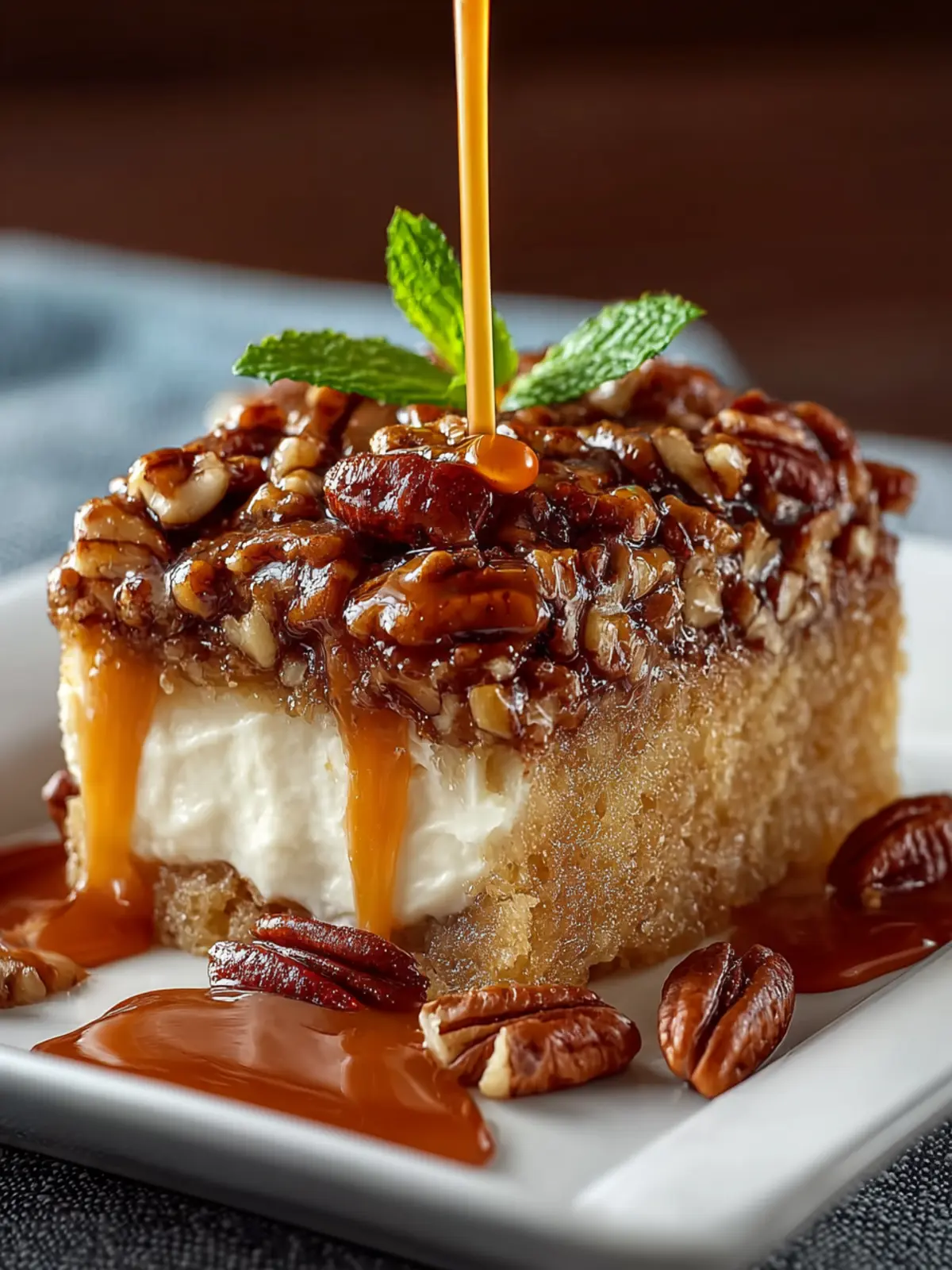 This delicious caramel pecan cake is a delightful dessert that features a moist cake soaked in sweetened condensed milk and topped with a rich caramel sauce and praline topping.