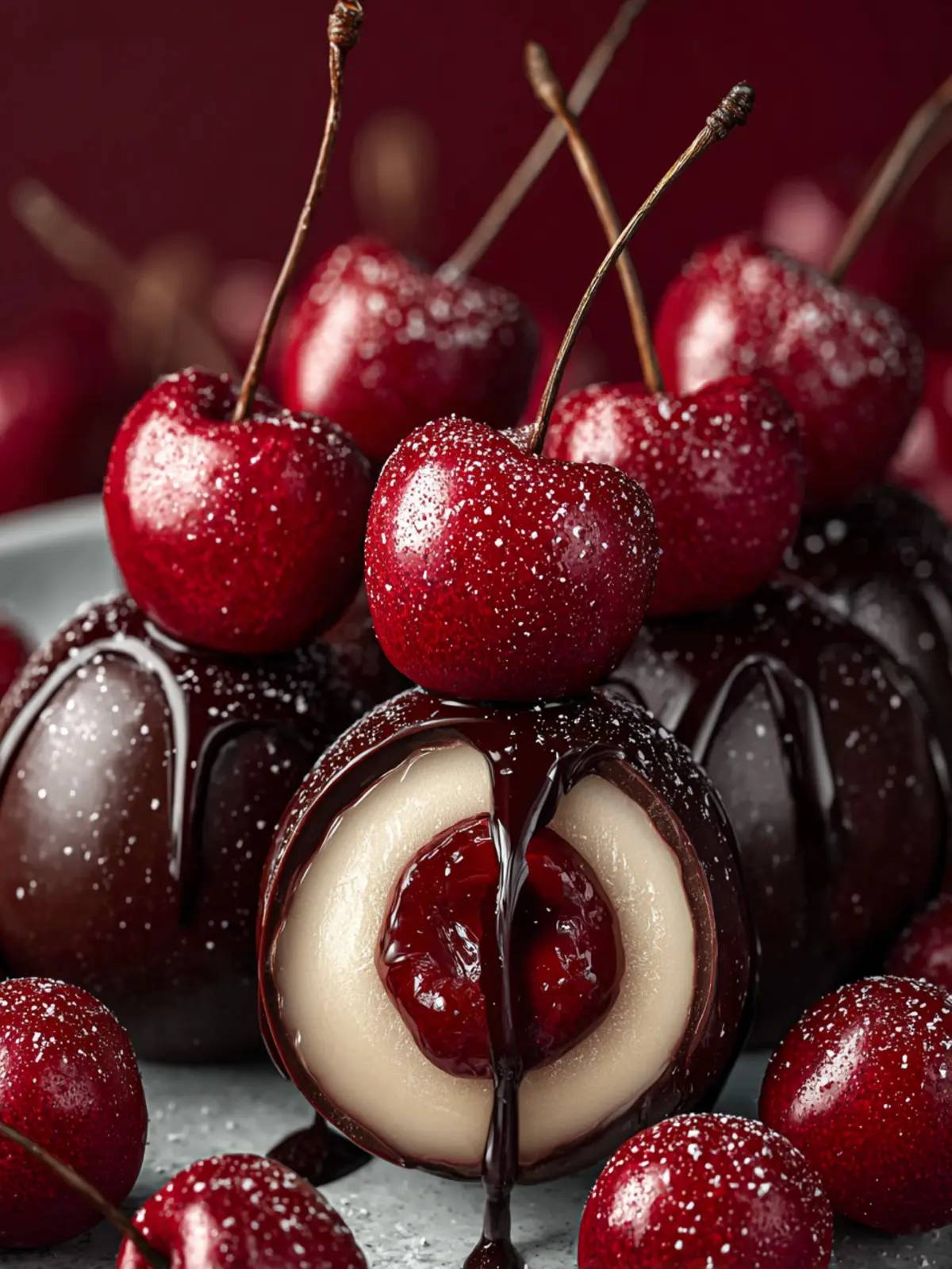 Garnish with Fresh Cherries: Top each chocolate-filled cherry bomb with a fresh cherry or a sprinkle of powdered sugar to create an eye-catching garnish that screams summer freshness.