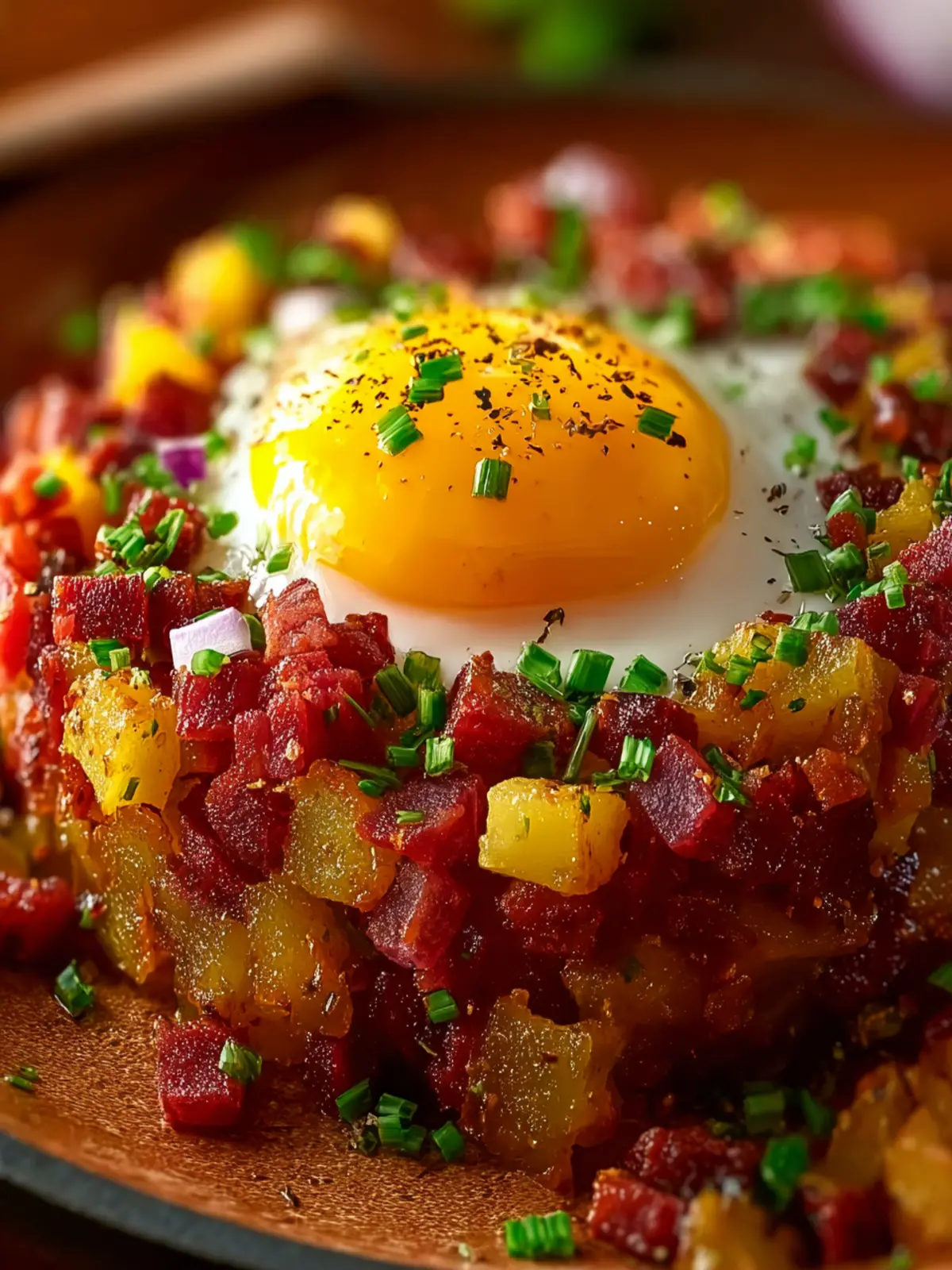 A delicious corned beef hash made with tender potatoes, onions, and seasoned to perfection.