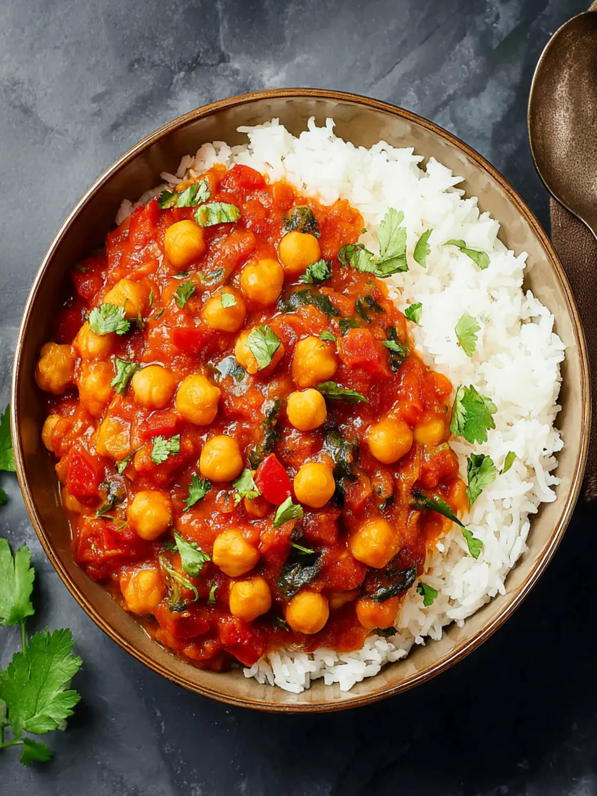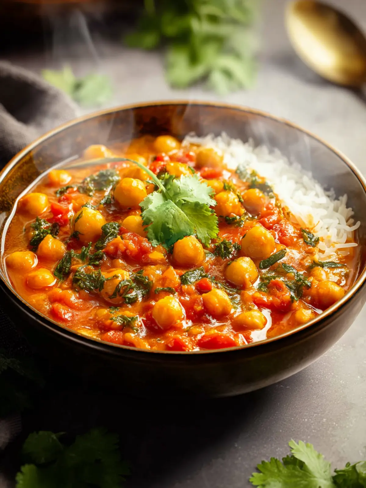 A flavorful chickpea and spinach curry, perfect for serving with basmati rice.