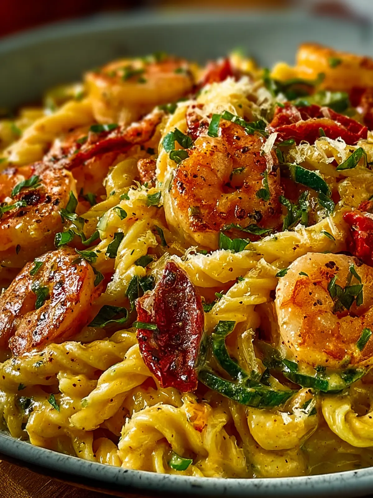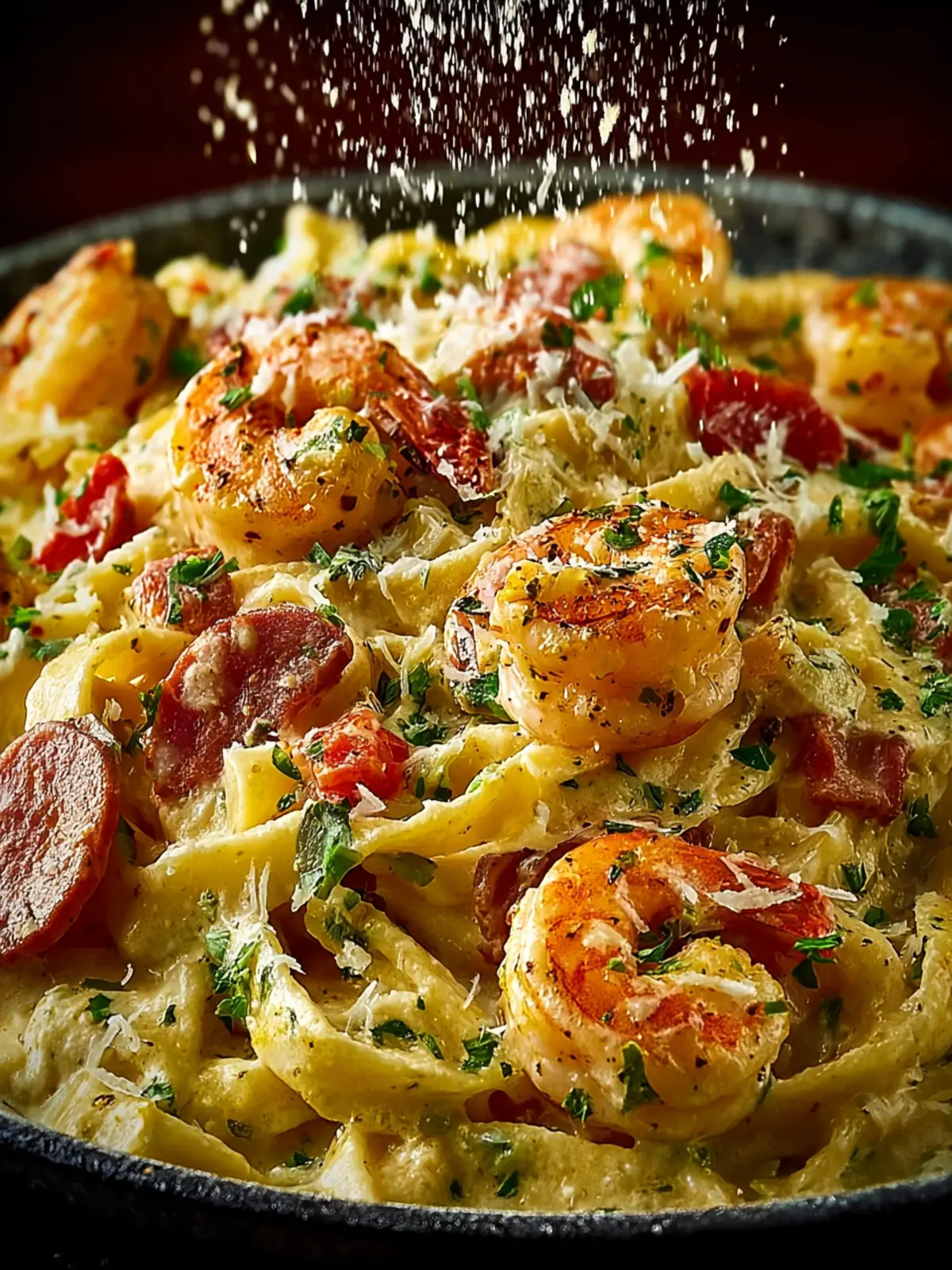 A delicious Cajun shrimp fettuccine that combines tender shrimp, chicken, and andouille sausage tossed in a creamy sauce with bell peppers and parmesan.
