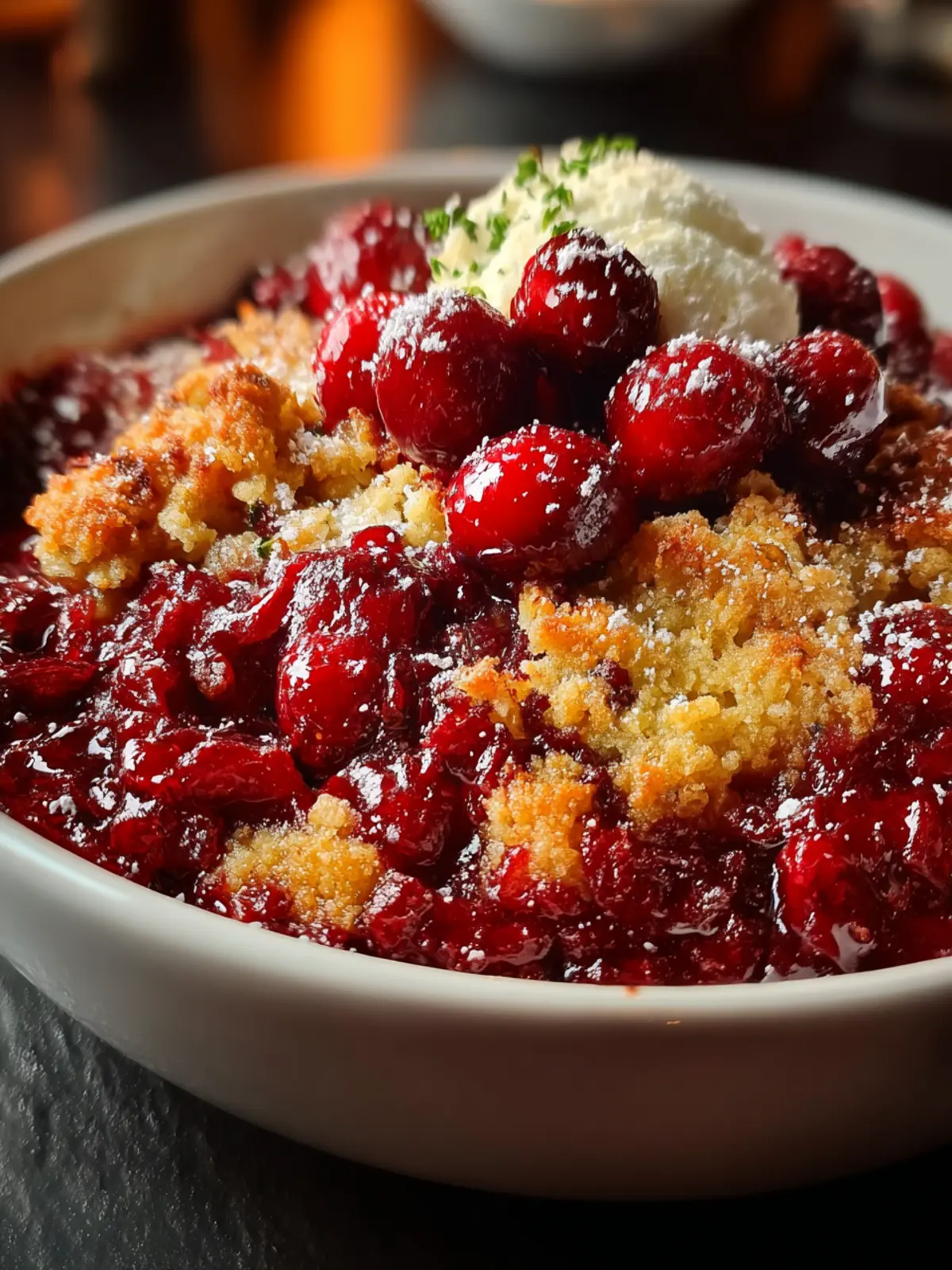 A delicious cranberry crisp with a buttery topping, perfect for serving warm.
