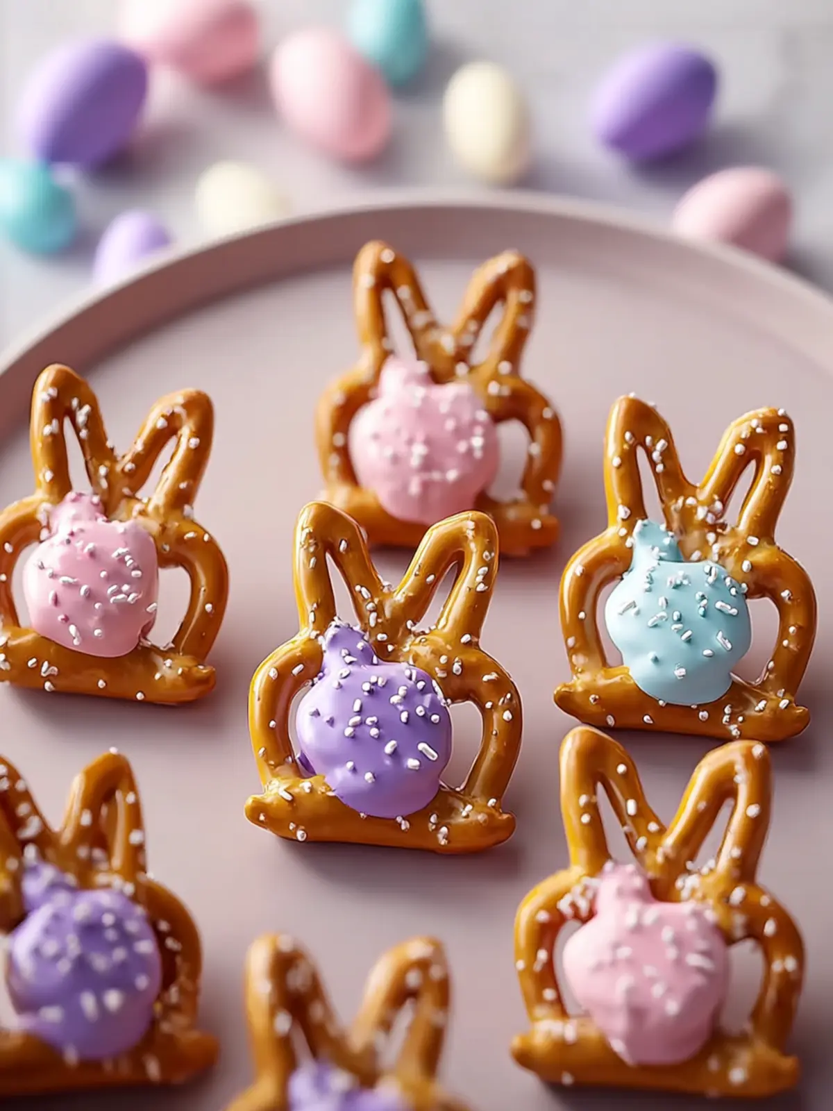 Delicious bunny-shaped pretzels topped with white chocolate and colorful sprinkles, perfect for any festive occasion!
