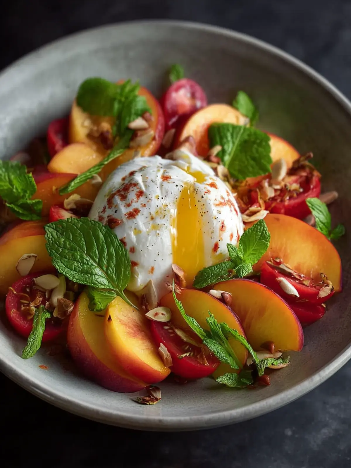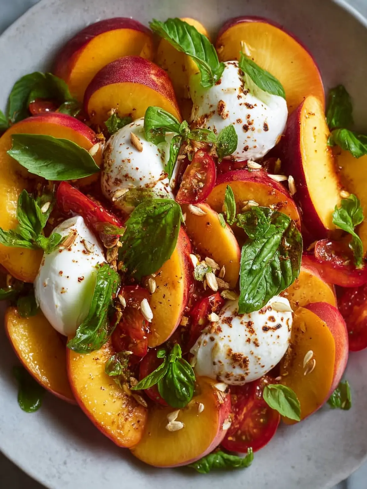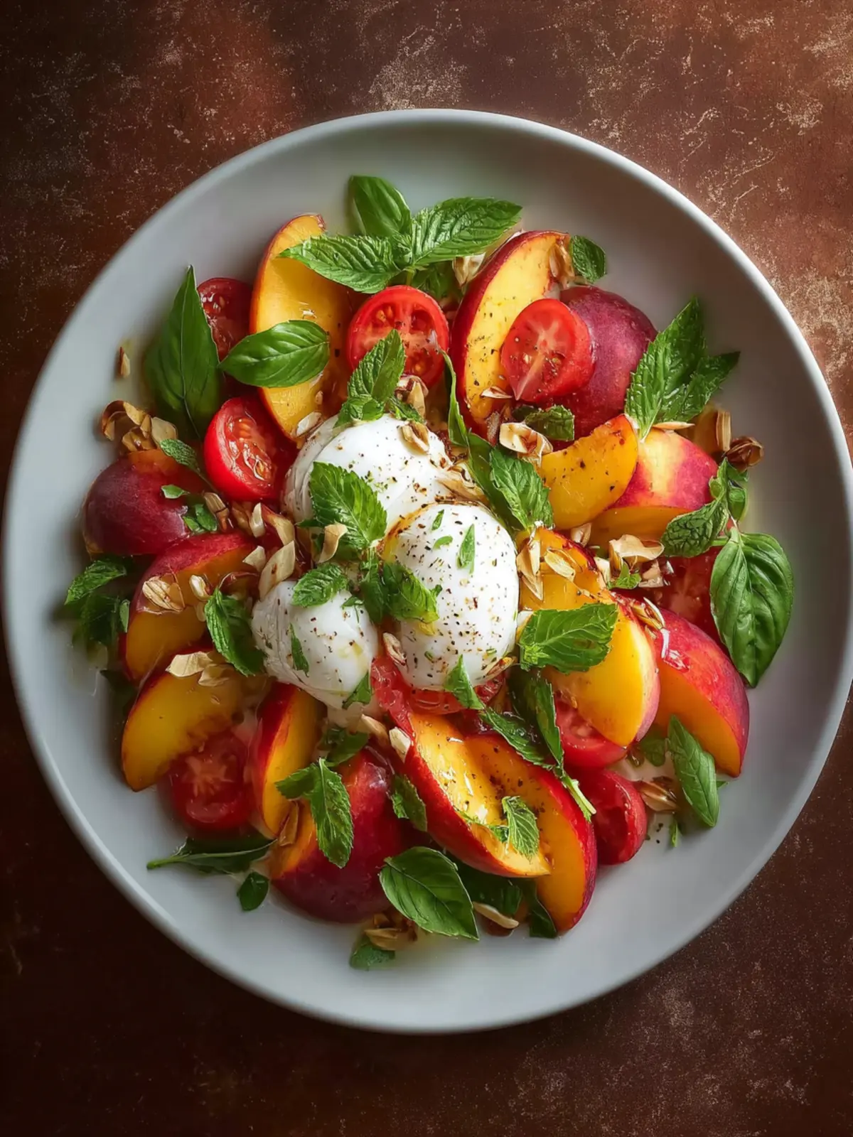 A refreshing salad that combines the sweetness of peaches with the creaminess of burrata and the crunch of toasted nuts.