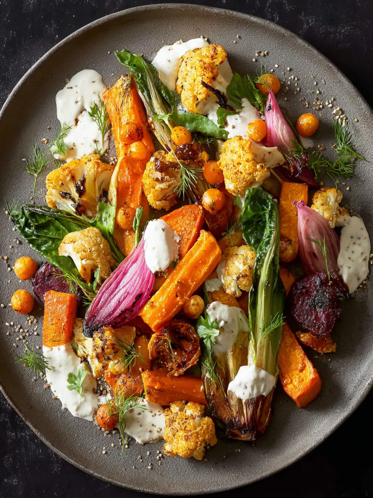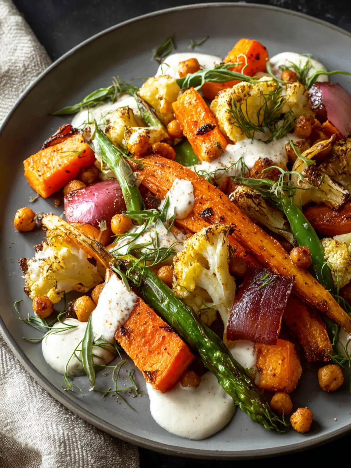 A nutritious and delicious bowl filled with roasted vegetables, chickpeas, and a creamy tahini yogurt sauce.