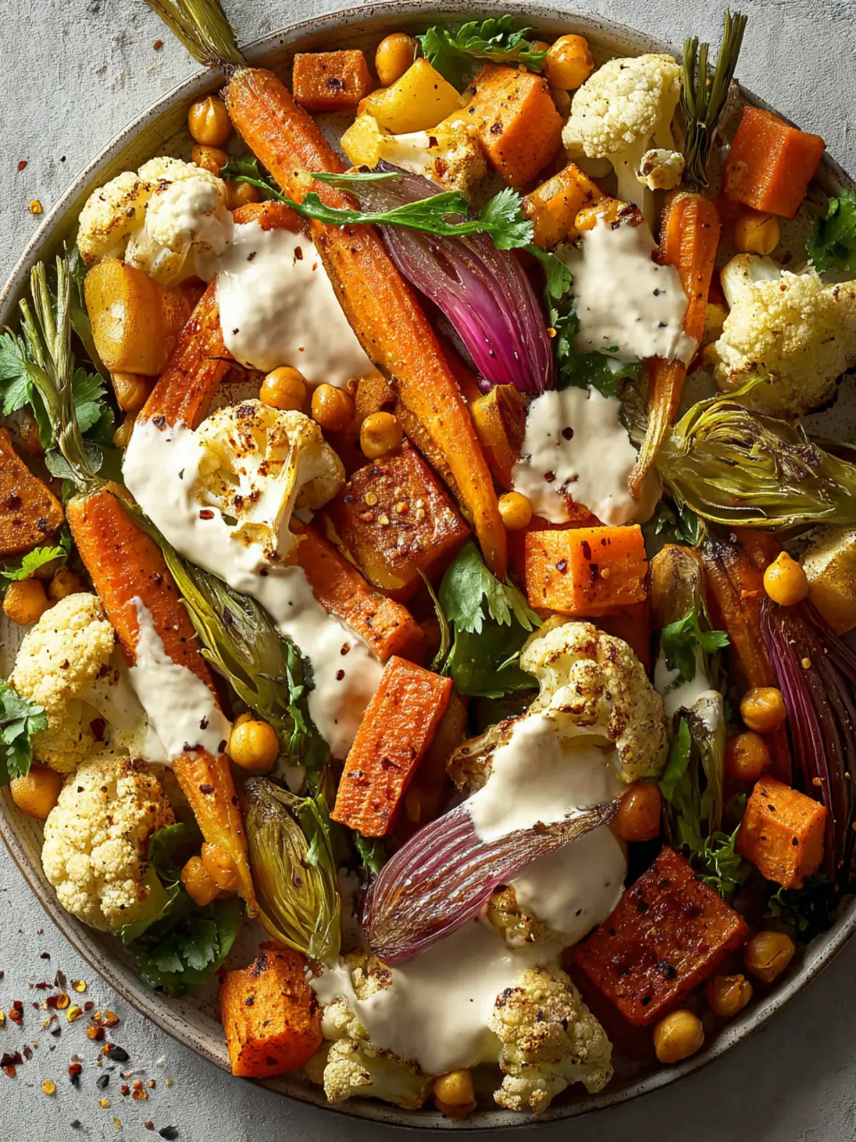 This dish is a flavor bomb, bursting with the earthy richness of roasted veggies like carrots, bell peppers, and zucchini. Roasting caramelizes the natural sugars and intensifies the flavors, while the tahini sauce introduces a silky texture and nutty essence that perfectly complements the vegetables. A hint of lemon will brighten the overall profile, tying all the flavors together beautifully.
